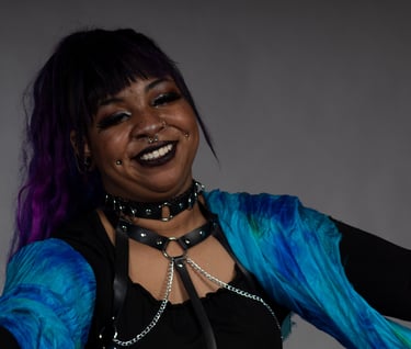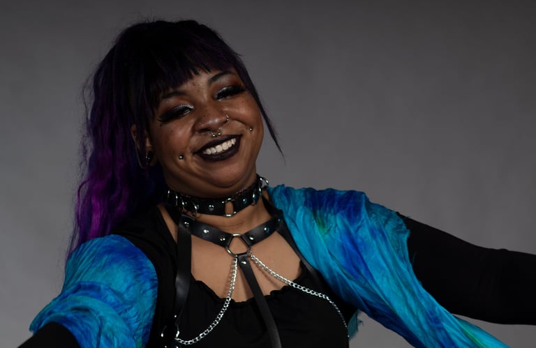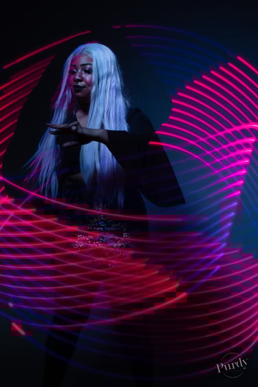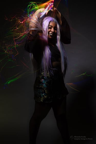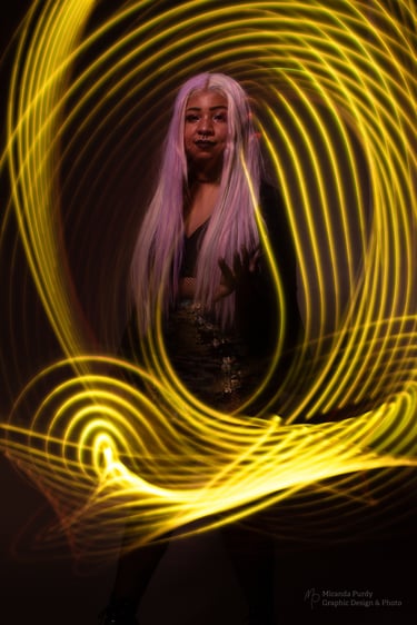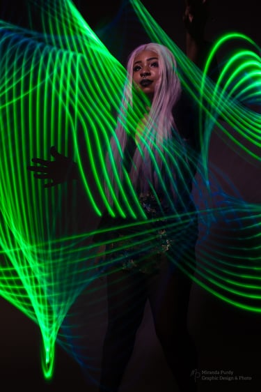 In this photo set, I wanted to attempt to create bright portraits while my model artist moved. Unlike the vibrant lights I had photographed in the prior shoot, I used significantly more light and a faster shutter speed to capture brighter still images.